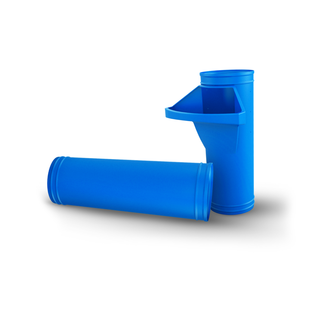 A peça duto de entulho (modelo padrão) é fabricada em polietileno de média densidade, material virgem, garantindo alta resistência, reutilização e total reciclabilidade. Utiliza a gravidade para o descarte dos resíduos e possui módulos encaixáveis, tornando o manejo simples e rápido, além da possibilidade de uso simultâneo em vários pavimentos.